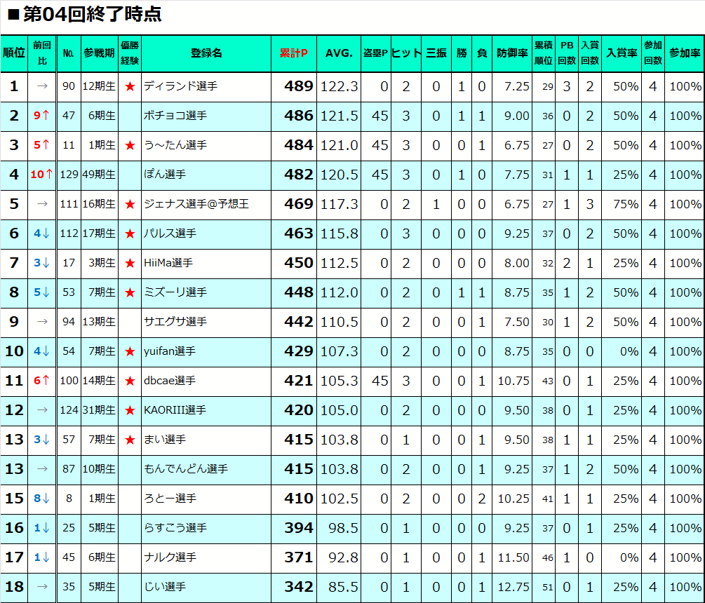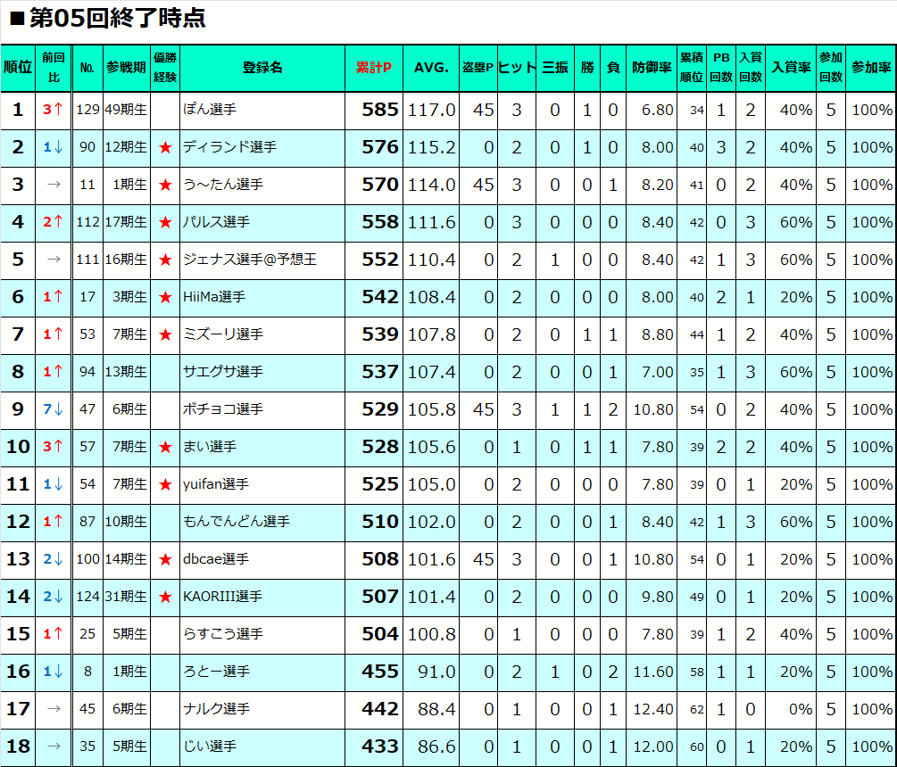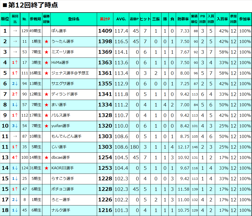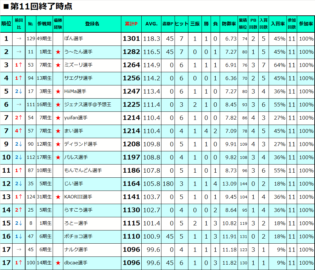 参戦期 | 【Y1G】(前身「Y1」)に初めて参戦された期間です。 | 防御率 | (週間)予想ポイントランキングの平均順位です(累積順位÷参加回数)。参加率が50%以上の場合のみ表示されます。 |