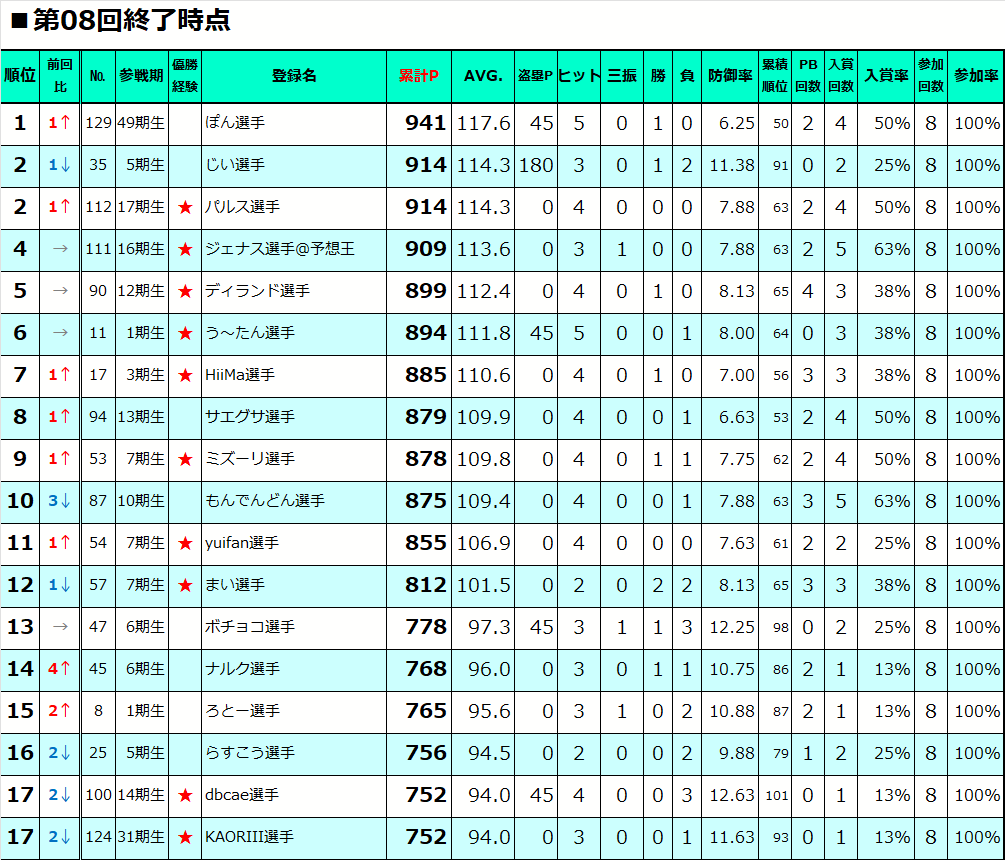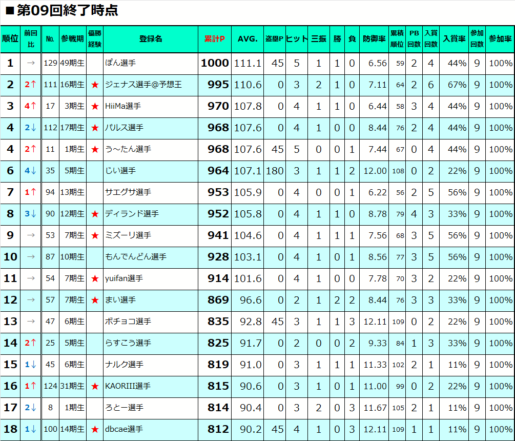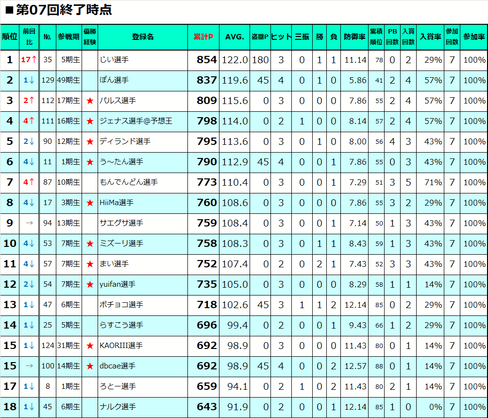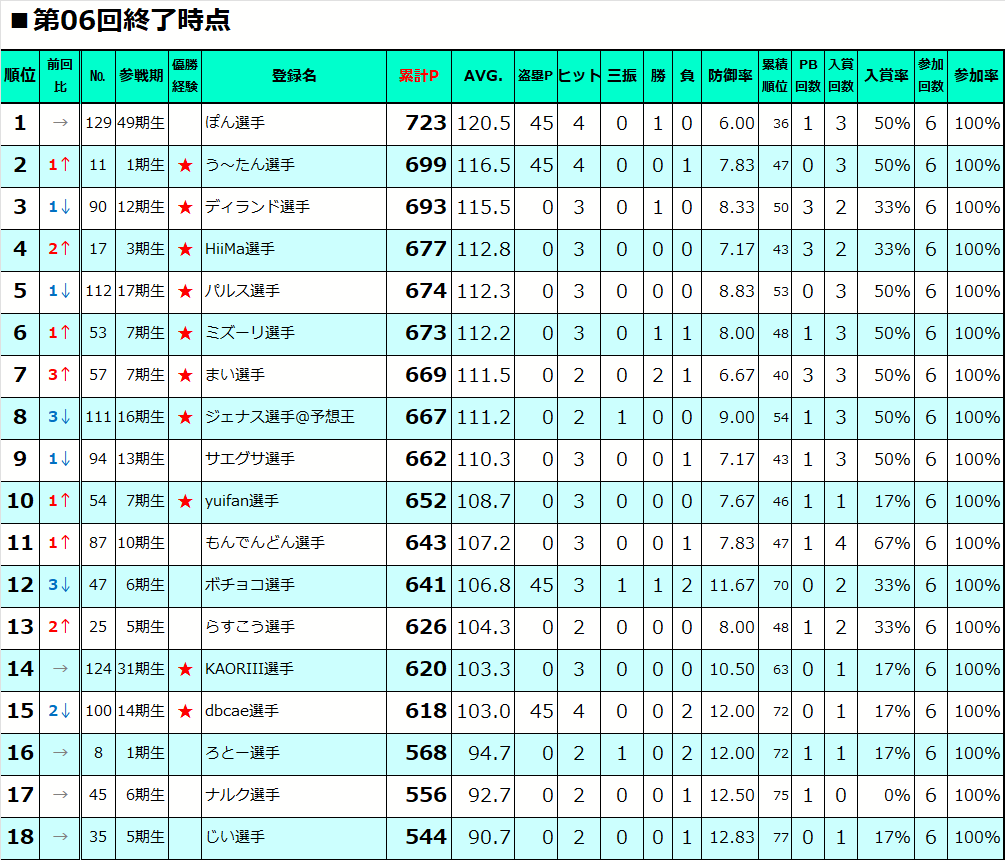 45 | ナルク選手 | 前期は終始低空飛行状態でした。今期は上位進出したい。 |